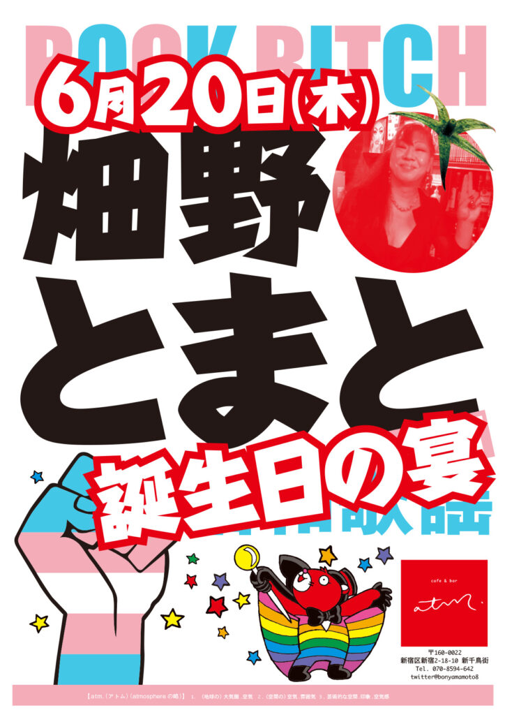 今日のatm.はトランスジェンダープライド代表・the atmos.のドラムスでもある畑野とまと嬢・誕生日の宴。『昭和歌謡ナイト』。懐かしい昭和歌謡曲を聴きながら、出てくる出てくるうんちく話を聞きながら、よき日をお祝いしましょう。