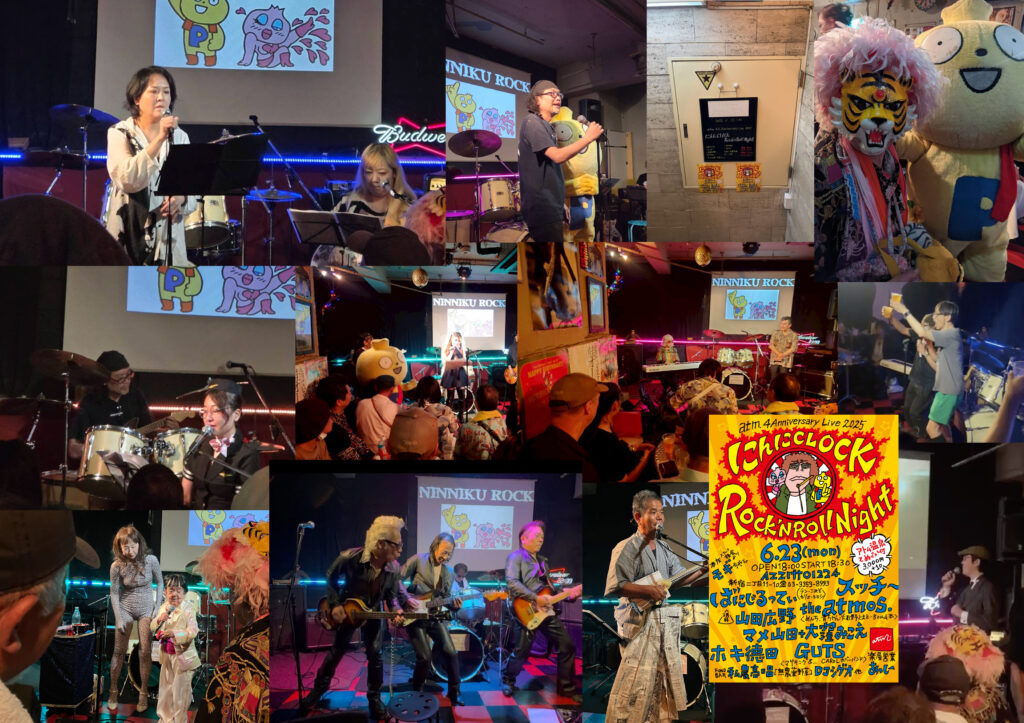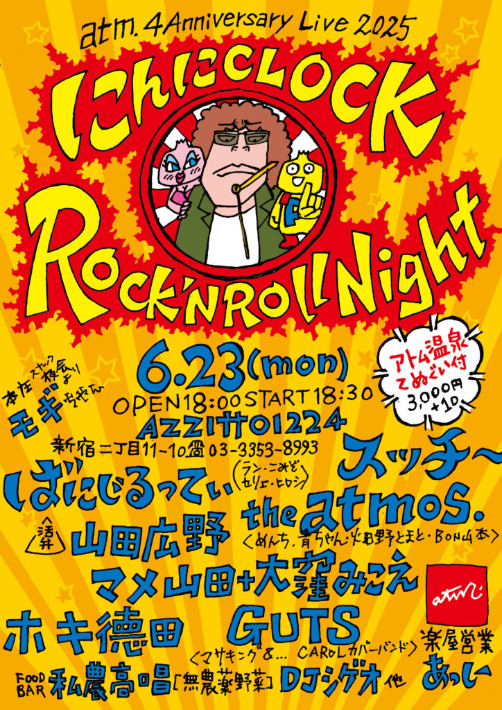 一夜明けて昨日の休みはめっちゃくちゃ疲れてしまい頭も体も動かずほぼ死んでた。そんな一昨日。遅ればせながらatm.4周年 にんにCLOCK・ROCK’NROLL NIGHT。まさかの月曜日という日程の中、お集まりただきありがとうございました。出演およびスタッフの皆様お疲れ様でした。気がつけば豪華メンバーなこともあって、元気に楽しい時間になったのではないかと思っております。半月ほど痛風とかの影響で酒を絶っていた反作用でぜんぜん酔わないなあと思ってはいたのだが、案外酔っていたようで失敗なかったでしょうか。あったら先に謝っておきますね。『アトム温泉タオル』は気に入っていただけたでしょうか。ばたばたと過ぎていく時間に写真を撮るのを忘れてしまっていて全然ないので撮った写真送ってください。まあそんな訳でatm.4周年。新宿二丁目新千鳥街というこの場所で何時の間にか経っている4年間(プラス半年)を思い返せば大変だったって記憶ばかり。いろいろなことがあったし、これからもあるんじゃないかなって思いますが、過去に手伝ってくれた人や現在一緒に居る人や、去っていってしまったり、新しく現れたり。いったいどんな形で来年の6月を迎えるのか全く想像もつきませんが、今後ともよろしくお願いしますね。まあそんな訳で一日一日atm.頑張って行ってみようと思います。
