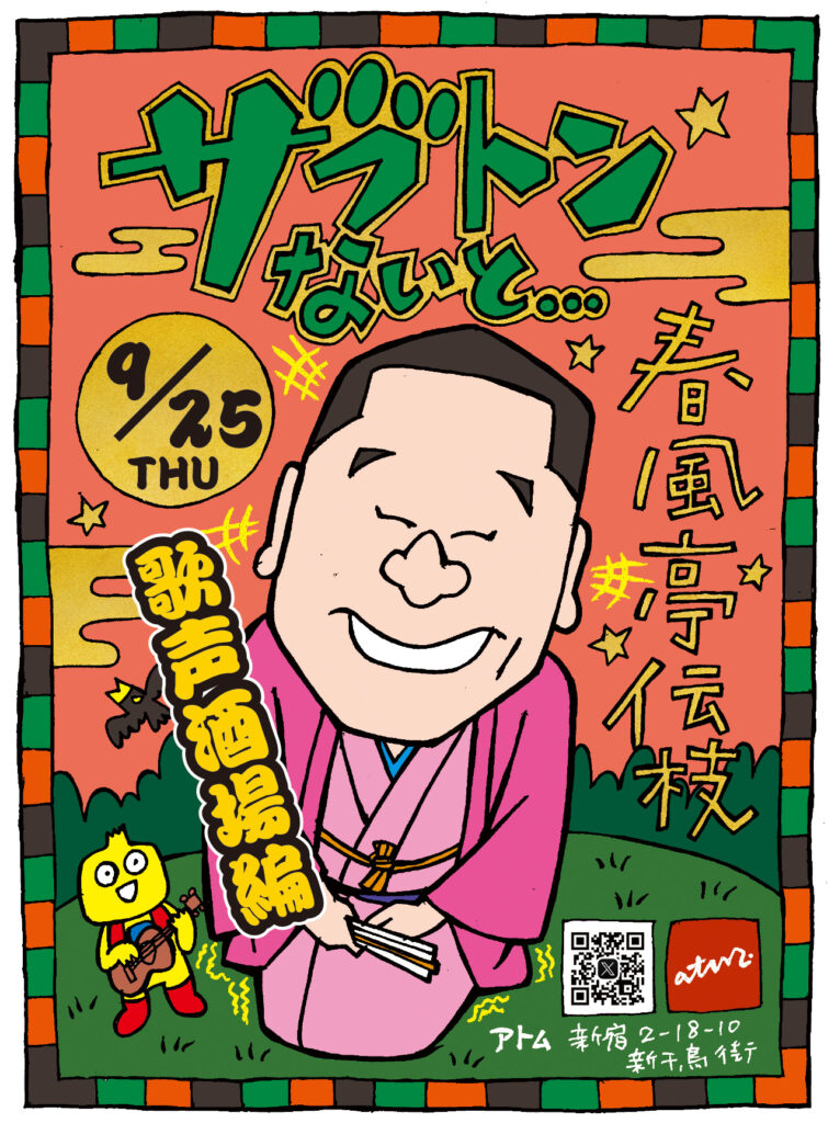 さあさあお立ち会い。今日のatm.は春風亭伝枝の『ザブトンないと』師匠とはもう20年も昔、1000人名刺に向けて頑張ってたBONはゴールデン街の郷。名刺ができて時が過ぎ、いつしか二ツ目は真打に、出世魚ならぬ名前も変わり、白髪混じりで再会すれば、あれよあれよとお店手伝ってくれることになった。そんな2回目の今日はアコースティックギターと明星の歌本駆使した歌声喫茶ならぬ歌声酒場。高座と違って座布団のないatm.のカウンター。我が子のように大切に育てた食虫植物は暑さで全滅とショックで泣いてたけど、そこは師匠のつらいとこ心の痛みを出す訳にはいかない。きっと笑顔で迎えます。だから今は泣かないで。みんなの歌声と師匠のギター元気掛け算で参りたいと思います。ウクレレもあるしね。素敵な風吹きますように。