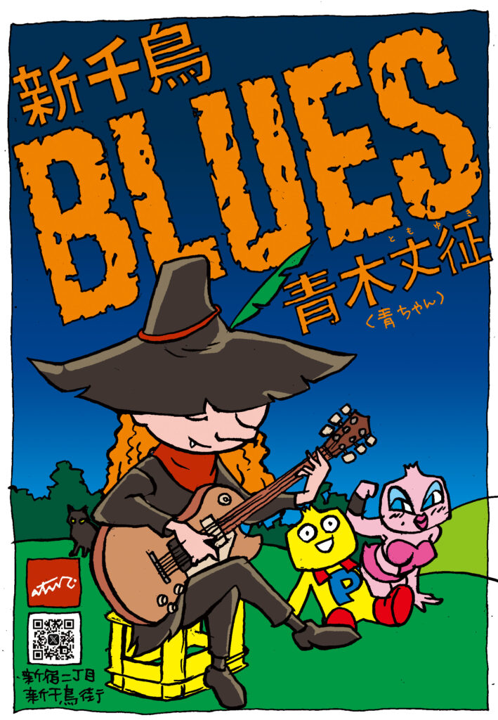 今日のatm.は新宿生まれ新宿育ち、歌舞伎町のスーパーギタリスト・青木丈征(ともゆきと読む)青ちゃん。界隈でたくさんバンドやってて、DirtyChordや三文役者とか歌麿呂とか…atm.のバンド・the atmos.もギタリストやってもらっている。そんな新千鳥BLUESで楽しくやりましょう。よろしく!素敵な風吹きますように。