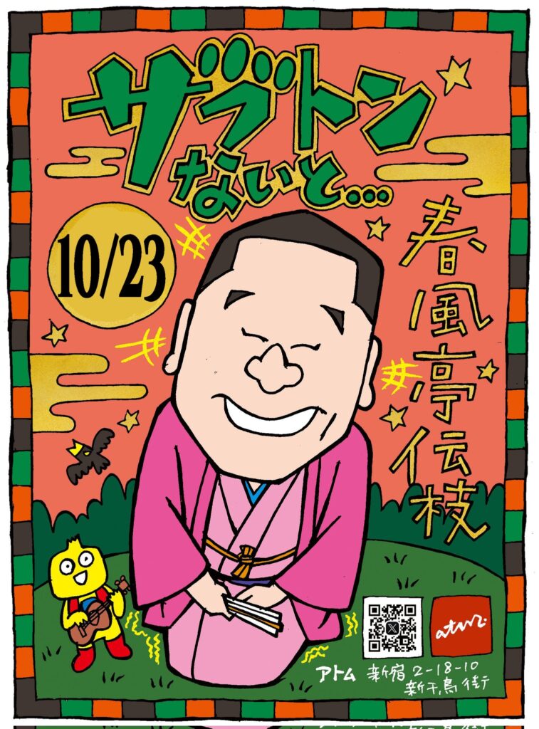 今日のatm.は春風亭伝枝の『ザブトンないと』。鶴は千年亀は万年。宇宙はどこにあるのだろう。行けども行けども宇宙である。宇宙は広くて果てしないね。そんな新千鳥街のatm.で師匠としゃべったり飲んだり歌ったり。素敵な風吹きますように。