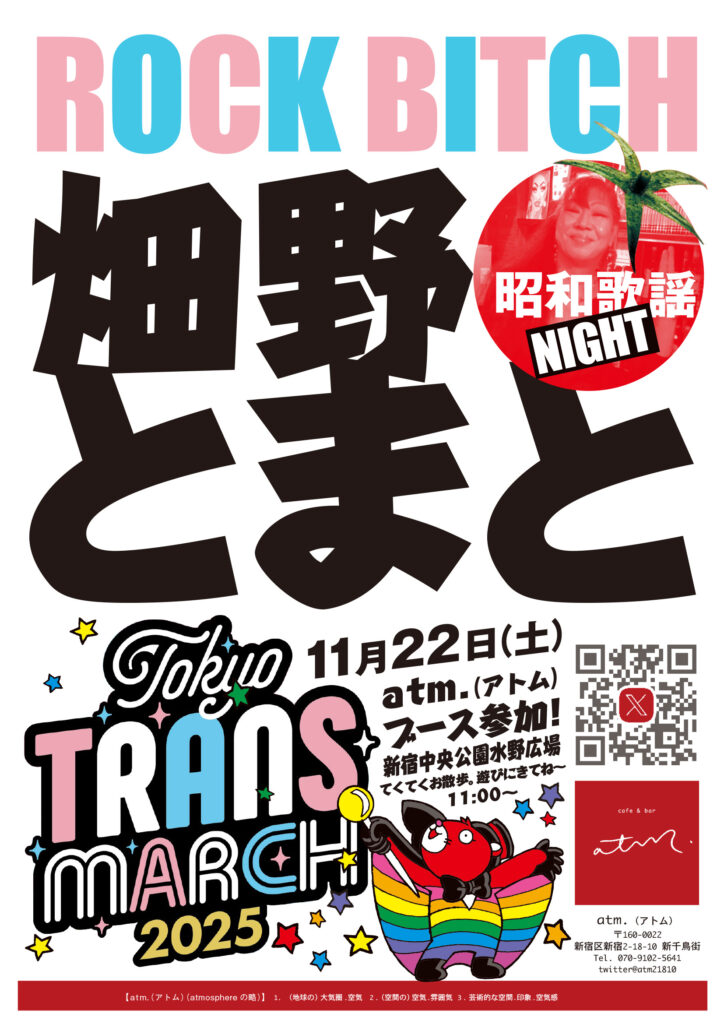 今日のatm.はトランス代表。the atmos.ドラムス。畑野とまと。『昭和歌謡ナイト』。11月に開催するトランスマーチは 22日・土曜日。atm.でブース出すから遊びにきてね。どんな感じになるだろう。ブース終わったらatm.で打ち上げ営業できるといいな。懐かしい昭和歌謡を聴きながら、出てくる出てくるうんちくをお楽しみください。素敵な風吹きますように。